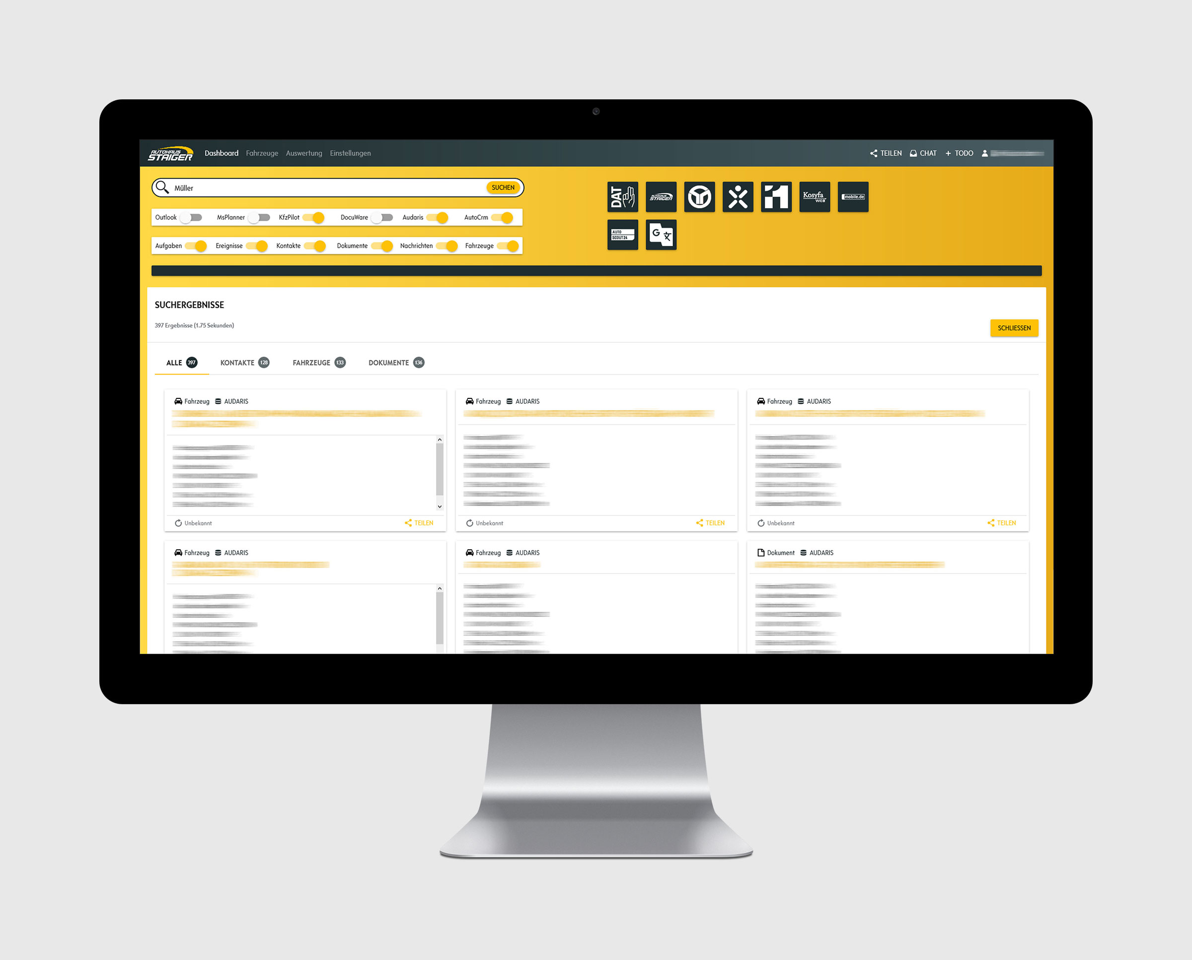 Über die Suchfunktion kann das gesamte Unternehmen mit einem einheitlichen Suchsyntax durchsucht werden. Innerhalb von Millisekunden lassen sich somit Datensätze, wie z. B. Kontakte, Fahrzeuge oder Dokumente, in den verschiedensten Systemen auffinden.